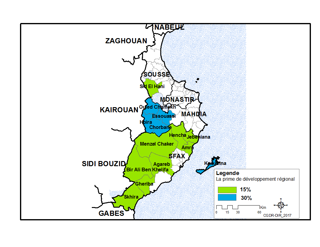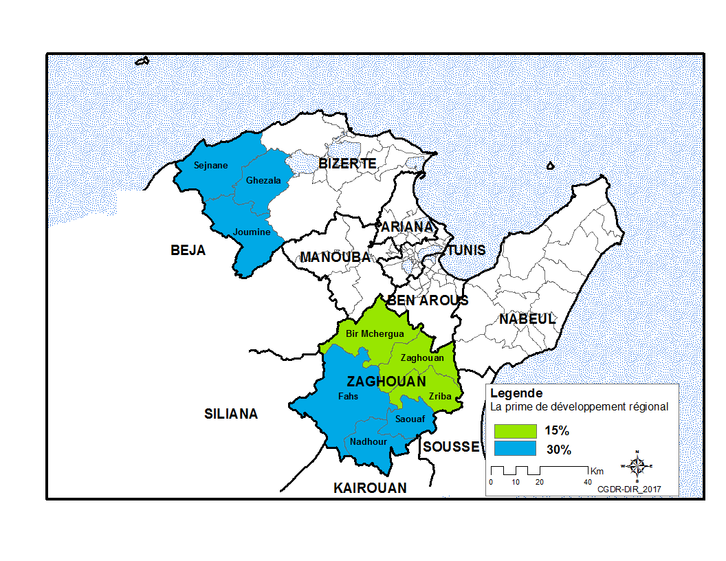 | délégation | gouvernorat | Prime de développement régional | Distance par rapport à la capitale | Distance par rapport au gouvernorat | Nombre de zones industrielles | Nombre d’entreprises existantes |